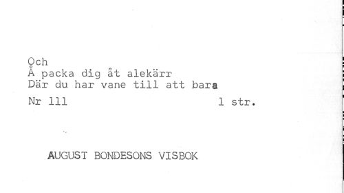 //// i ¦ //// Och o | //// A packa dig åt alekärr //// Där du har vane till att bara I //// Nr 111 1 str. //// I //// AUGUST BONDESONS VISBOK ////
