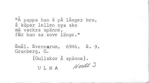 //// o //// "A pappa han ä på långer bro, //// å-köper lellen nya sko mä vackra spänné, för han sa sove länge." //// Smål. Svennarum, 6946, S. 9. Granberg, G. //// (Gullskor å spänne). U L M A fl*^* J //// .i //// . . . _ .. ___ ___..-ii,^:,^. J ////