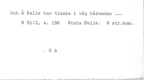//// o //// Och A Pelle han traska i väg häromdan ... ; //// B 51:2, s. 158 Stuta Pelle. 9 str.kom. //// . R A //// __ , A - äg. c. ^ .i -___ .,. _,_ __L ////