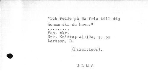 //// "Och Pelle på öa fria till dig honom ska du hava." //// Fon. skr. //// Nrk, Knista? 41:134, s. 50 Larsson, R. //// (Friarvisor). //// m //// U L M A ////