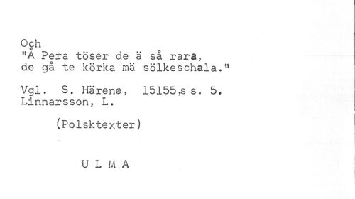 //// Och //// "A Pera töser de ä sa rara, de gå te korka mä sölkeschala." //// Vgl. S. Härene, 15155 ,s s. 5. Linnarsson, L. //// (Polsktexter) //// i //// U L M A ////