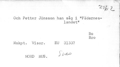 //// Och Petter Jönsson han såg i "Fäderneslandet" //// Bo Bro //// Mskpt. Visor. EU 31337 //// NORD MUS. J ////