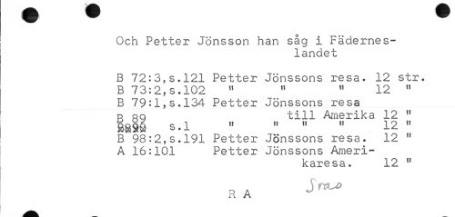 //// Och Petter Jönsson han såg i Fäderneslandet //// B 72:3,s.121 Petter Jönssons resa. 12 str. B 73:2,s.102 " « " 12 " //// B 79:1,s.134 Petter Jönssons resa //// B 89 till Amerika 12 ,f //// B898 s.l 11 » « 11 12 ft //// B 98:2,s.191 Petter Jönssons resa. 12 " A 16:101 Petter Jönssons Amerikaresa. 12 " //// \ fVUD //// RA J ////
