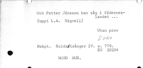//// Och Petter Jönsson han såg i fäderneslandet . . . //// (uppt L.A. Rignell) //// Utan prov //// Mskpt. Solda/tsånger IV. s. 779. //// •EU 28204 //// \ //// NORD MUS. ////