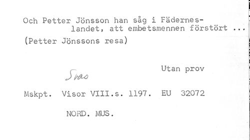 //// ! //// Och Petter Jönsson han såg i Fädernes- - //// landet, att embetsmennen förstört ... //// (Petter Jönssons resa) //// ! //// P //// Utan prov i //// Mskpt. Visor VIII.s. 1197. EU 32072 //// NORD. MUS. //// / ¦ ////