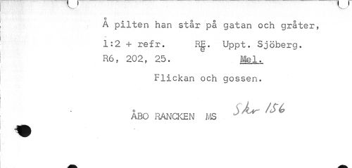 //// V.."V.__ //// o //// A pilten han star på gatan och gråter, //// 1:2 + refr. RE. Uppt. Sjöberg. R6, 202, 25. Mel. //// Flickan och gossen. //// ) Aat /S b //// ABO RANCKEN MS ////