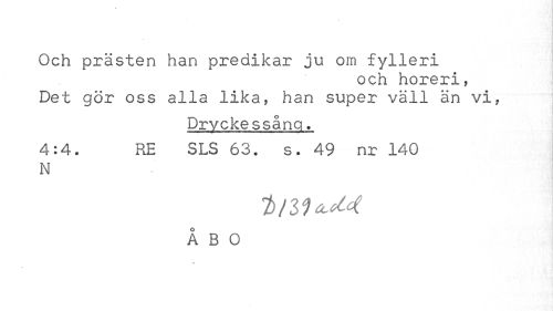 //// Och prästen han predikar ju om fylleri //// och horeri, //// Det gör oss alla lika, han super väll än vi, //// Dryckessång. //// 4:4. RE SLS 63. s. 49 nr 140 N //// ÅBO ////