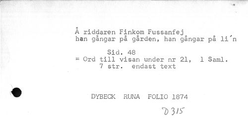 //// o //// A riddaren Finkorn Fussanfejo //// han gångar på gården, han gångar på li'n //// Sid. 48 //// = Ord till visan under nr 21, 1 Sami. //// 7 str. endast text //// w DYBECK RUNA FOLIO 1874 //// T>3 & ////