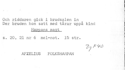 //// > , //// t //// Och riddaren gick i brudsalen in //// Der bruden hon satt med tarar uppa kind j //// Harpans magt ! //// i //// s. 20, 21 nr 6 mel-not. 15 str. //// 7) Q /= ^ //// AFZELIUS FOLKSHARPAN ////