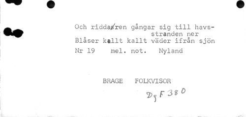 //// Och ridda/ren gångar sig till havs- //// o stranden ner //// Blåser kallt kallt väder ifrån sjön //// Nr 19 mel. not. Nyland //// BRAGE FOLKVISOR ////