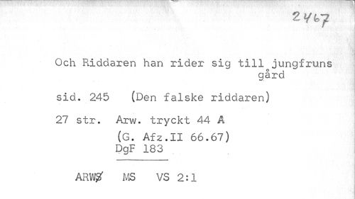 //// 2 //// Och Riddaren han rider sig till jungfruns //// gård //// sid. 245 (Den falske riddaren) //// 27 str. Arw. tryckt 44 A //// (G. Afz.II 66.67) DgF 183 //// ARW MS VS 2:1 ////