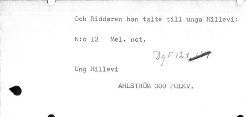 //// Och Riddaren han talte till unga Hillevi: N:o 12 Mel. not. //// ijP/iijpr //// Ung Hillevi //// ^^ AHLSTRÖM 300 FOLKV. ////