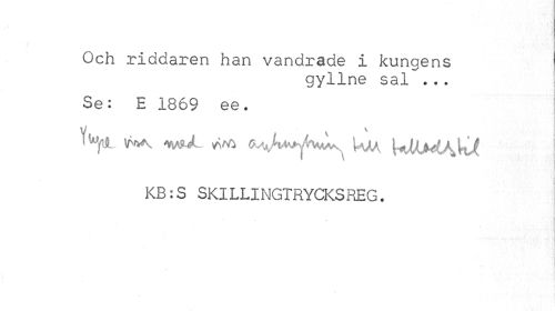 //// Och riddaren han vandrade i kungens I //// gyllne sal ... //// Se: E 1869 ee. //// KB:S SKILLINGTRYCKSREG. ////