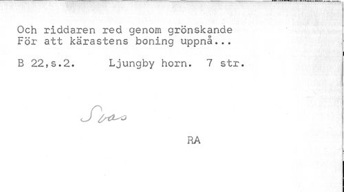 //// Och riddaren red genom grönskande För att kärastens boning uppnå... //// B 22?s.2. Ljungby horn. 7 str. //// CJérä^o i //// RA ////