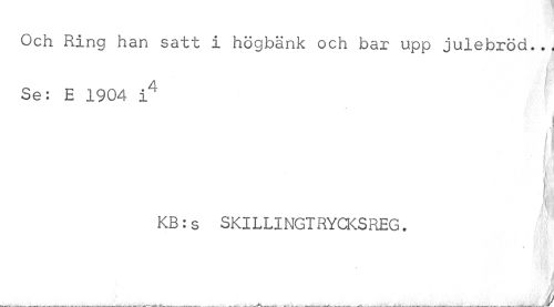 //// Och Ring han satt i högbänk och bar upp julebröd... //// 4 //// Se: E 1904 i' //// I 1 //// KB:s SKILLINGT RYCKSREG. //// i r| //// ? b,'i K$t| i •får. ////