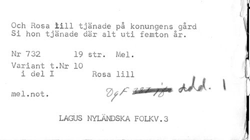 //// Och Rosa lill tjänade på konungens gård \| //// Si hon tjänade där alt uti femton år. v //// Nr 732 19 str. Mel. 1 //// Variant t.Nr 10 (] //// i del I Rosa lill , y //// me 1. no t. 2>f / &# ^ ' , //// LAGUS NYLANDSKA FOLKV.3 I //// ll ////