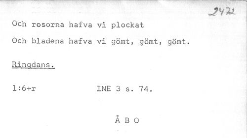 //// i //// Och rosorna hafva vi plockat //// Och bladena hafva vi gömt, gömt, gömt. //// Ringdans. //// 1;6+r INE 3 s. 74, //// ÅBO ////