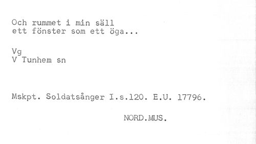 //// Och rummet i min säll ett fönster som ett öga... //// Vg //// V Tunhem sn //// Mskpt. Soldatsånger I.s.120. E.U. 17796. //// NORD.MUS. ////