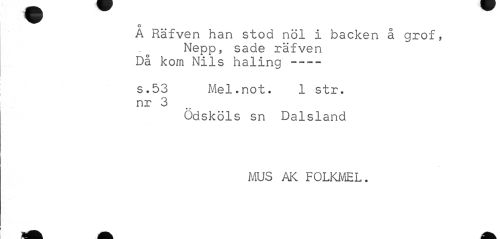 //// ° o //// A Räfven han stod nöl i backen a grof, //// Nepp, sade räfven Då kom Nils haling --- //// s.53 Mel-not. 1 str. nr 3 //// » //// Odsköls sn Dalsland //// MUS AK FOLKMEL. ////