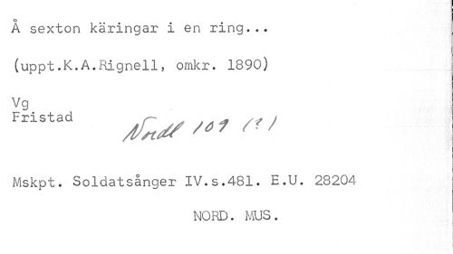 //// Å sexton käringar i en ring... (uppt.K.A.Rignell, omkr. 1890) //// Vg FriSt3d //// Mskpt. Soldatsånger IV.s.481. E.U. 28204 //// NORD. MUS. //// I i //// Y ' ////