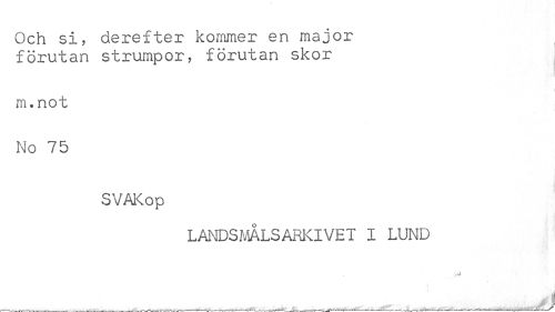 //// Och si, derefter kommer en major förutan strumpor, förutan skor //// j //// m. not No 75 //// SVAKop //// LANDSMÅLSARKIVET I LUND //// J>) //// ni i (rii^^lff^ ////