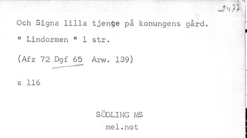 //// Och Signa lilla tjen^e på konungens gård. //// k //// " Lindormen " 1 str. (Afz 72 Dgf 65 Arv/. 139) //// s 116 //// SODLING MS //// mel.not j ////