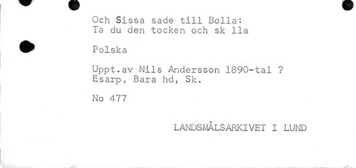 //// Och Sissa sade till Bolla: Ta du den töcken och sk Ila //// ^^ Polska //// Uppt.av Nils Andersson 1890-tal ? Esarp, Bara hd, Sk. //// No 477 //// LANDSMÅLSARKIVET I LUND //// \ ////