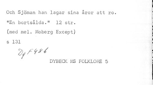 //// Och Sjöman han lagar sina åror att ro. !fEn bortsålda.11 12 str. //// (med mel. Moberg Except) j //// i //// s 131 ! //// DYBECK MS FOLKLORE 5 ! ////