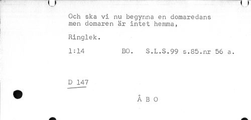//// Och ska vi nu begynna en domaredans men domaren är intet hemma, //// Ringlek. //// 1:14 BO. S.L.S.99 s.85.nr 56 a. //// D 147 //// ® ÅBO ////