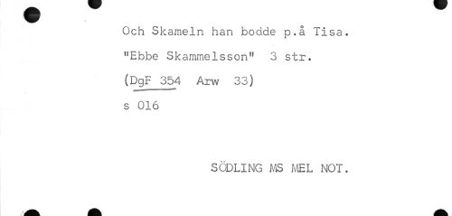 //// Och Skameln han bodde p.å Tisa. "Ebbe Skammelsson" 3 str. (DgF 354 Arw 33) //// j //// s 016 //// SODLING MS MEL NOT. ////