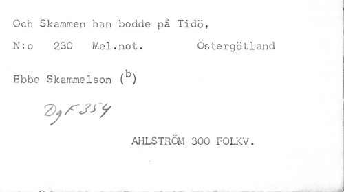 //// Och Skammen han bodde på Tidö, //// * * //// N:o 230 Mel.not. Östergötland //// /b //// Ebbe Skammelson ( ) //// AHLSTRÖM 300 FOLKV. ////