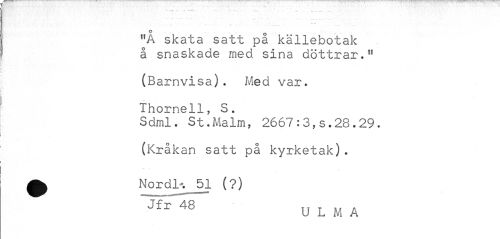 //// " ** ' //// "Å skata satt på källebotak å snaskade med sina döttrar." //// (Barnvisa). Med var. //// Thornell, S. //// Sdml. St.Malm, 2667:3,s.28.29. (Kråkan satt på kyrketak). //// ^ Nordl^Jxl (?) //// 48 ~ U L M A ////