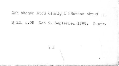 //// v //// Och skogen stod dimmig i höstens skrud ... B 22, s.25 Den 9. September 1899. 5 str. //// v] J //// R A //// \ \ \ //// ...J ////