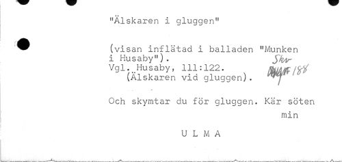 //// * * //// "Älskaren i gluggen" //// (visan inflätad i balladen "Munken //// i Husaby"). Sk^tr //// Vgl. Husaby, 111:122. Btöffi 0 (Älskaren vid gluggen). //// Och skymtar du för gluggen. Kär söten //// min //// U L M A ////