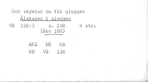 //// Och skymtar du för gluggen //// ti 4 //// Älskaren i gluggen //// VS 126:3 s. 138 4 str. //// (Skv 188) //// — ' -r,w "il //// AFZ MS KB KB VS 126 //// t //// j ////