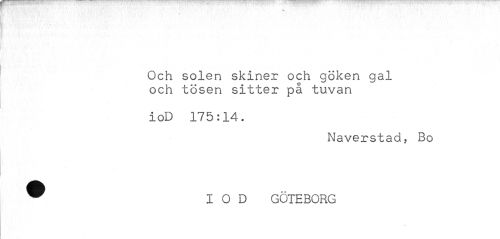 //// ' > v'-.'. . /• . v v ,¦ •¦-'':¦.' • P . .'[ •' . 1 ' 1 • • V »¦ //// Och solen skiner och göken gal och tösen sitter på tuvan //// ioD 175:14. //// Naverstad, Bo ® IOD GÖTEBORG ////