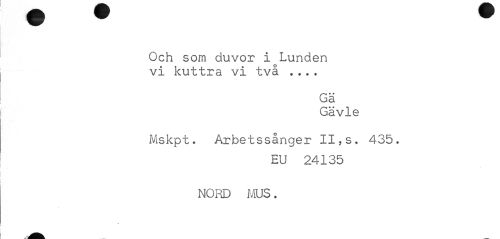 //// Och som duvor i Lunden vi kuttra vi två ... //// Gä //// Gävle //// Mskpt. Arbetssånger II, s. 435. //// EU 24135 //// NO I® MUS. ////