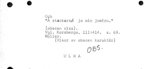//// Oph //// "A stackars/ ja min jumfru," (obscen visa). //// Vgl. Korsberga, 111:414, s. 69. Möller. //// (Vi sor av obscen karaktär) //// U L M A //// € ////