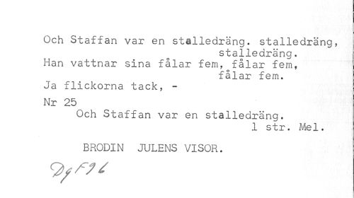 //// Och Staffan var en stalledräng, stalledräng, //// stalledräng. //// Han vattnar sina fålar fem, fålar fem, //// fålar fem. //// Ja flickorna tack, - I //// Nr 25 //// Och Staffan var en stalledräng. //// 1 str. Mel. //// BRODIN JULENS VISOR. //// 9/^ ////