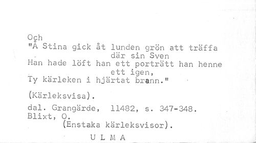 //// % //// Och //// O //// "A Stina gick åt lunden grön att träffa //// där sin Sven Han hade löft han ett porträtt han henne //// ett igen, Ty kärleken i hjärtat brann." //// (Kärleksvisa). //// dal. Grangärde, 11482, s. 347-348. Blixt, 0. //// (Enstaka kärleksvisor). //// U L M A ////