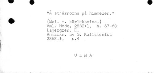 //// o //// "A stjärnorna pa himmelen." //// W (Me 1. t. kärleksvisa.) //// Vml. Hede, 2832:1, s. 67-68 Lagergren, E. //// Anmärkn. av G. Kallstenius 2868:1, s.4 //// ii' ^ //// U L M A ////