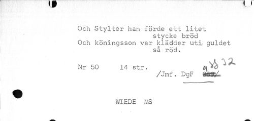 //// Och Stylter han förde ett litet //// stycke bröd Och köningsson var klädder uti guldet //// o * ? 1 //// sa rod. //// Nr 50 14 str. C\ x * //// /Jmf. DgF //// WIEDE MS ////