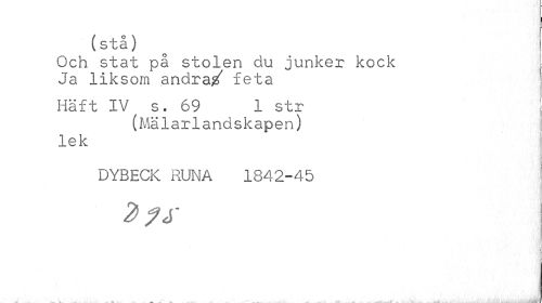 //// ! //// (stå) //// Och stat på stolen du junker kock Ja liksom andra/ feta //// Häft IV s. 69 1 str //// (Mälarlandskapen) //// lek //// DYBECK RUNA 1842-45 //// [ ////