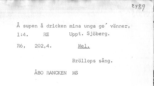 //// ¦ //// ° o * 1 //// A supen a dricken mina unga go vänner, 1:4. RE Uppt. Sjöberg. //// R6, 202,4. Me1. //// Bröllops sång. ÅBO RANCKEN MS ////