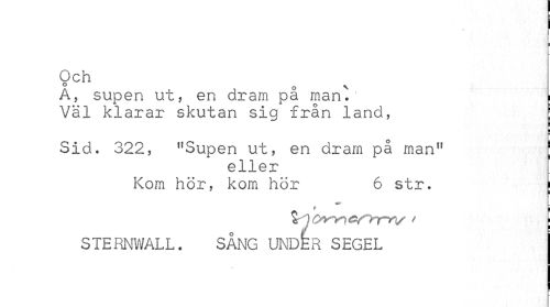 //// ¦ //// Och //// A, supen ut, en dram på manV ; //// Väl klarar skutan sig från land, //// i //// Sid. 322, tfSupen ut, en dram på mant! ; //// eller //// Kom hör, kom hör 6 str. I //// ^ * I //// Ovm t i //// STERNWALL. SÅNG UNDER SEGEL ////