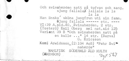 //// Och svinaherden satt på tufvan och sang, //// sjung fallala/ lallala la la ^^ ^ la la //// Han önska' sköna jungfrun uti sin famn. //// Sjung fallala--- etc.--- //// VI:39 A,sid.40,_Svinaherden, 2 str. (Tosterö) Emil Öberg mel not,sid 125 Variant 39 B "Och svinaherden satt på //// en kulle ..." 14 str. (Barva) //// G. Ericsson //// Kom§ Arwidsson_(2:104 AoB) nPehr Svi*" //// naherde" WAHLFISK SÖDERMLD ÄLD KULTH (1MINSON) . ...Vjf?1>7 //// _r^- T*^ - ? ...• j\ ___Jm__„___— ~ _ ////