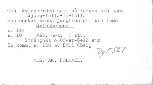 //// Och Svinaherden satt på tufvan och sang //// Sjung-falla-la-lalla Han önskar sköna jungfrun uti sin famn //// Svinaherden //// s. 114 //// s. 10 Mel. not. 1 str. //// « //// Strängnäs o Ofver-Selö s:r Se komm. s. 108 av Emil Oberg //// ^ AÄ 7 //// MUS. AK. FOLKMEL. ////