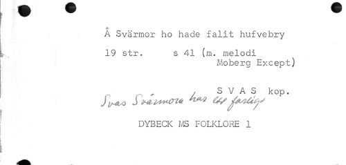 //// o //// A Svärmor ho hade falit hufvebry //// 19 str. s 41 (m. melodi //// Moberg Except) //// S V A S kop. DYBECK MS FOLKLORE 1 ////