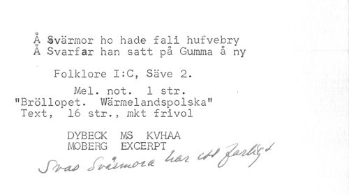 //// o //// A Svärmor ho hade fali hufvebry A Svarfar han satt på Gumma å ny //// .s //// Folklore I:C, Säve 2. //// Mel. not. 1 str. "Bröllopet. Wärmelandspolska" Text, 16 str., mkt frivol //// DYBECK MS KVHAA MOBERG EXCERPT ////
