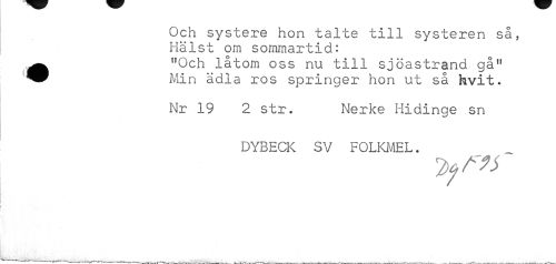 //// Och systere hon talte till systeren så, Hälst orn sommartid: //// •"Och låtom oss nu till sjöastrand gå" Min ädla ros springer hon ut så hvit. //// Nr 19 2 str. Nerke Hidinge sn //// DYBECK SV FOLKMEL. ////